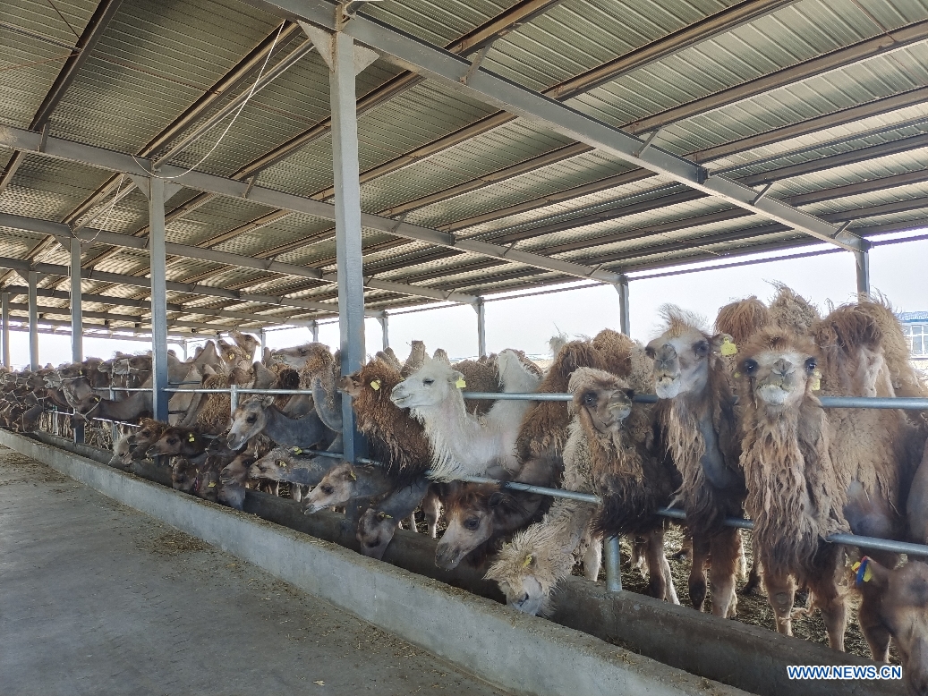 Camels eat grass in a breeding base in Shache County, northwest China's Xinjiang Uygur Autonomous Region, May 21, 2020. (Xinhua/You Huiyuan)