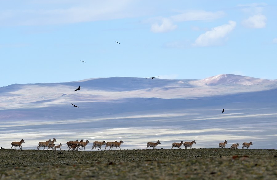 Photo taken on July 17, 2020 shows Tibetan antelopes near Rongmar Township of Nyima County at the Qiangtang National Nature Reserve in southwest China's Tibet Autonomous Region. (Xinhua/Chogo)