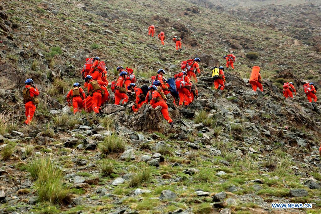 Rescuers search for victims in Jingtai County of Baiyin City, northwest China's Gansu Province, May 23, 2021. Lasting almost 24 hours, rescue work came to an end after extreme weather killed 21 during a 100-km cross-country mountain marathon race in Baiyin City, northwest China's Gansu Province, the local rescue headquarters said on Sunday. (Fire and Rescue Department of Gansu/Handout via Xinhua)