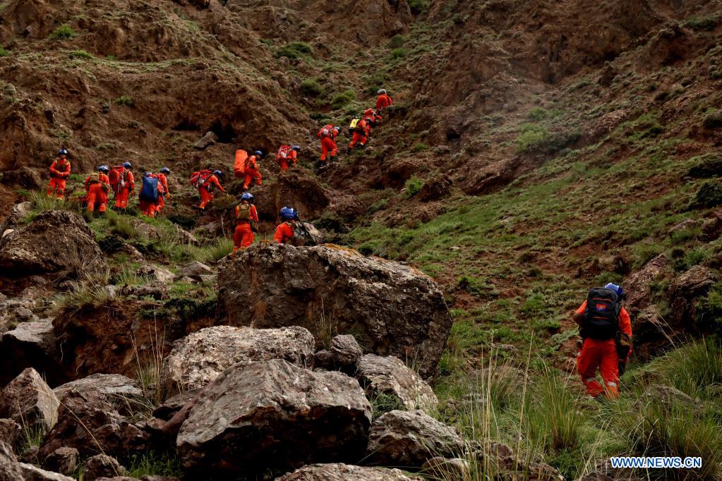 Rescuers search for victims in Jingtai County of Baiyin City, northwest China's Gansu Province, May 23, 2021. Lasting almost 24 hours, rescue work came to an end after extreme weather killed 21 during a 100-km cross-country mountain marathon race in Baiyin City, northwest China's Gansu Province, the local rescue headquarters said on Sunday. (Fire and Rescue Department of Gansu/Handout via Xinhua)
