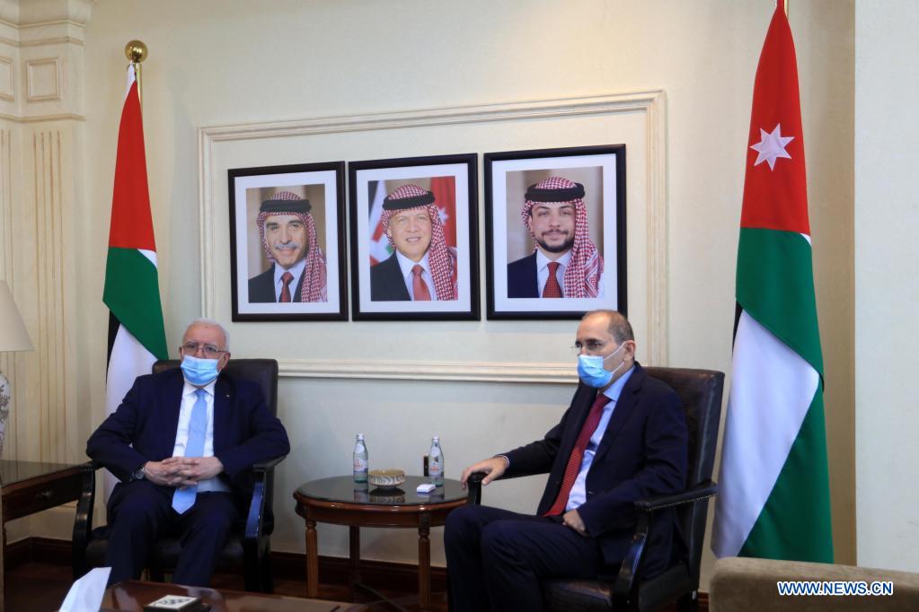 Jordanian Foreign Minister Ayman Safadi (R) meets with his visiting Palestinian counterpart Riyad al-Maliki in Amman, Jordan, on May 23, 2021. Jordan and Palestine on Sunday called for intensifying international efforts to end the Israeli occupation of the Palestinian territories, according to a statement by the Jordanian Foreign Ministry. (Photo by Mohammad Abu Ghosh/Xinhua)
