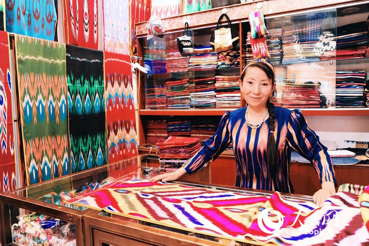 Tunsahan Abdugheni loves her beautiful Etles silk, which is traditionally used for Uygur people's daily clothes. (People's Daily Online/Kou Jie)