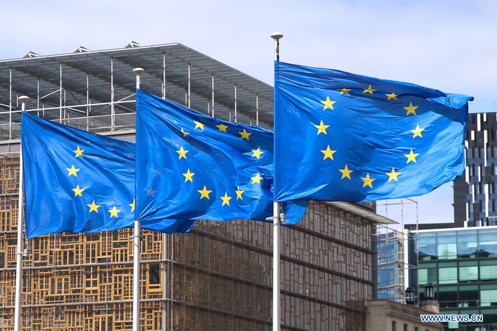 Flags of the European Union fly outside the EU headquarters in Brussels, Belgium, May 21, 2021. (Xinhua/Zheng Huansong)