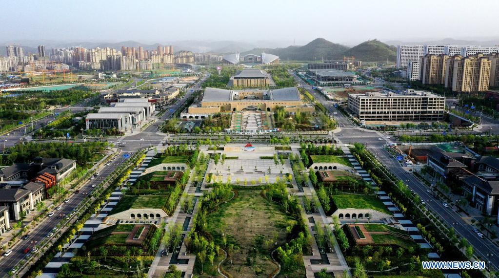 Aerial photo taken on May 7, 2021 shows a view of Yan'an New District in Yan'an City, northwest China's Shaanxi Province. Yan'an in northwest China's Shaanxi Province hosted the then headquarters of the Communist Party of China (CPC) and was the center of the Communist revolution from 1935 to 1948. The city is home to 445 former sites of the CPC's early revolutionary activities and boasts 30 revolution-themed museums. The city on the Loess Plateau has witnessed locals bid farewell to poverty. It has been green-coated thanks to its greening efforts. Bridging past and present, a new cityscape in the former revolutionary base is taking shape. (Xinhua/Liu Xiao)