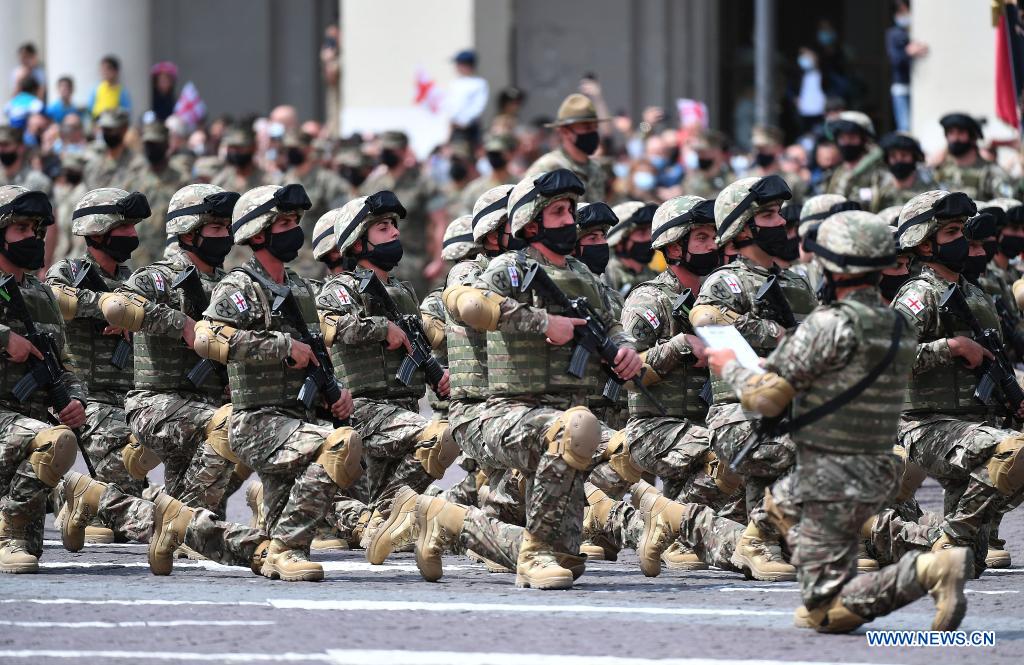 Georgian military personnel participate in the parade to celebrate the Independence Day at the Freedom Square in Tbilisi, capital of Georgia, on May 26, 2021. (Photo by Kulumbegashvili Tamuna/Xinhua)