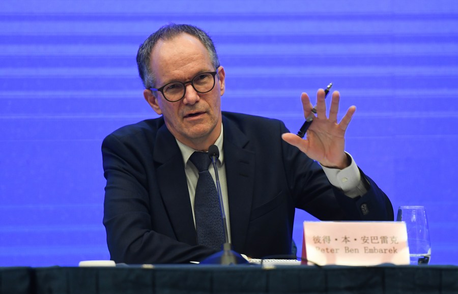 Peter Ben Embarek, a member of the WHO-China joint study team, answers questions at the WHO-China joint study press conference in Wuhan, central China's Hubei Province, Feb. 9, 2021. Global study on COVID-19 origins has found lab origin "extremely unlikely." (Xinhua/Cheng Min)