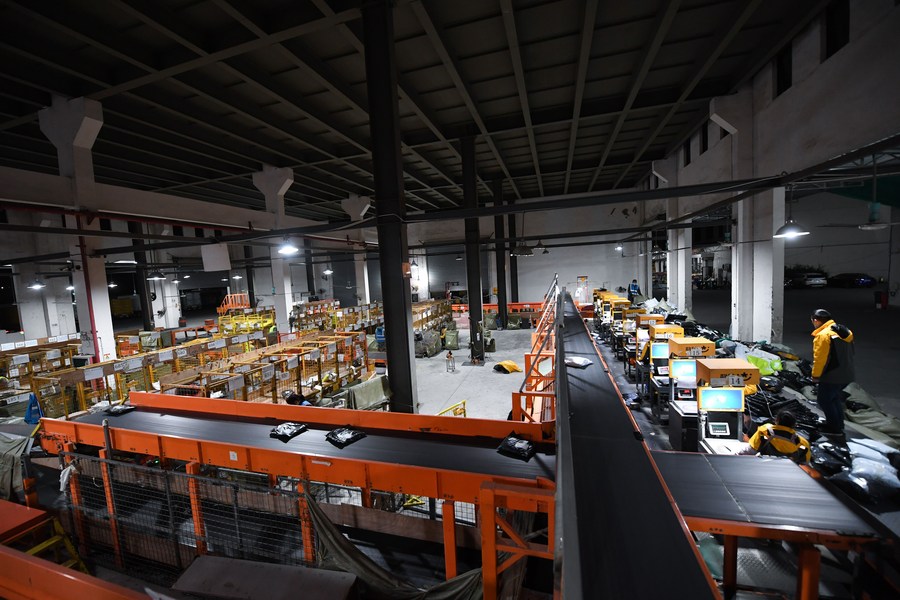 Staff workers work at a warehouse of courier service provider Yunda Express in Zhili Town of Huzhou, east China's Zhejiang Province, Feb. 8, 2021. (Xinhua/Xu Yu)