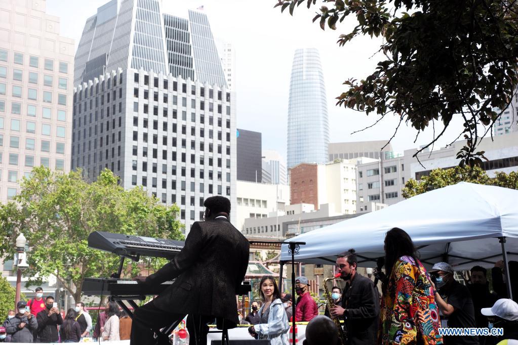 People perform to celebrate the Asian Pacific American Heritage Month at Portsmouth Square in Chinatown in San Francisco, California, the United States, May 29, 2021. (Xinhua/Wu Xiaoling)