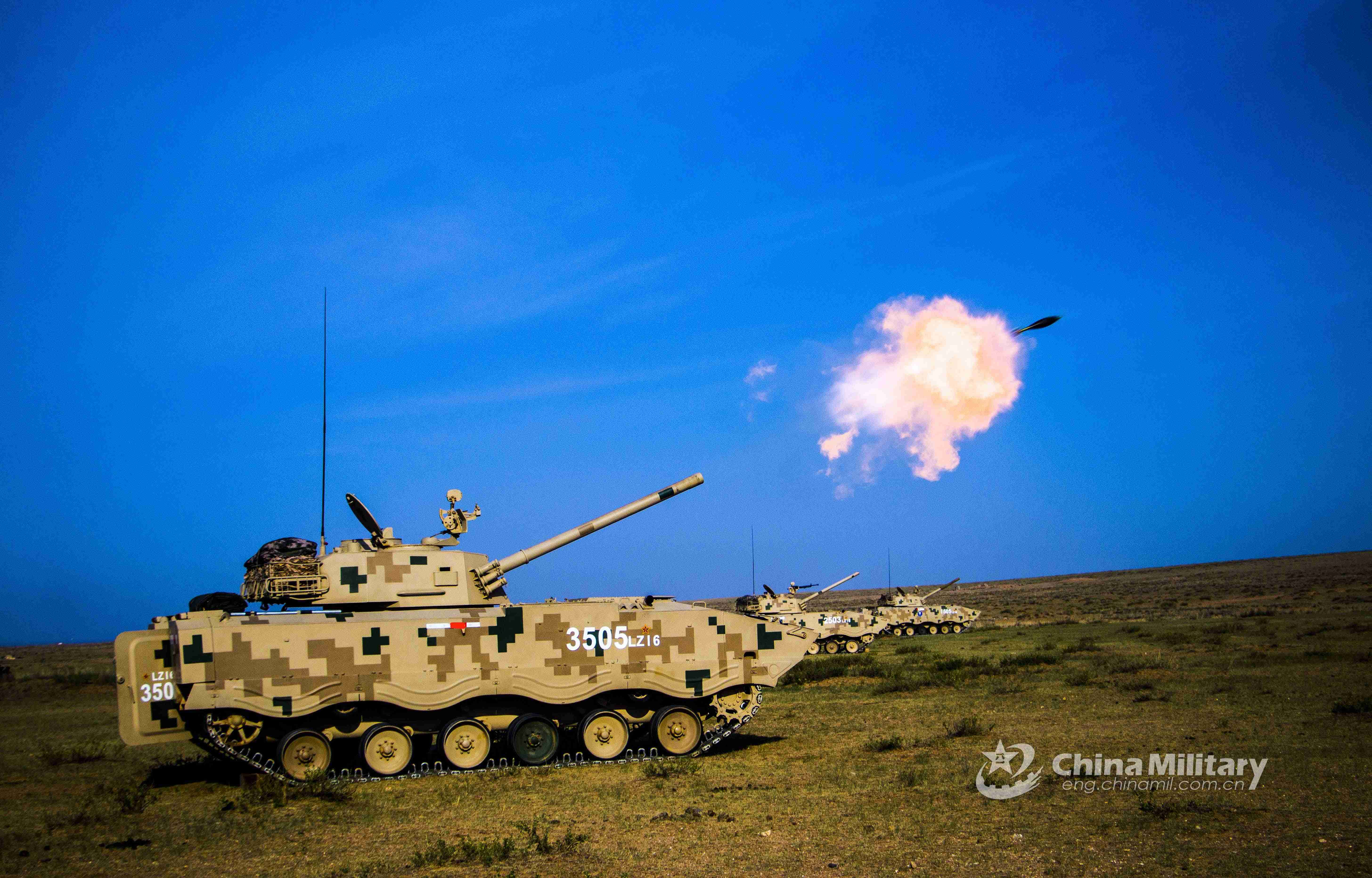 Armored vehicles attached to a brigade under the PLA 81st Group Army fire at mock targets during a live-fire training exercise on May 20,2021. (eng.chinamil.com.cn/Photo by Meng Qingzhuang)