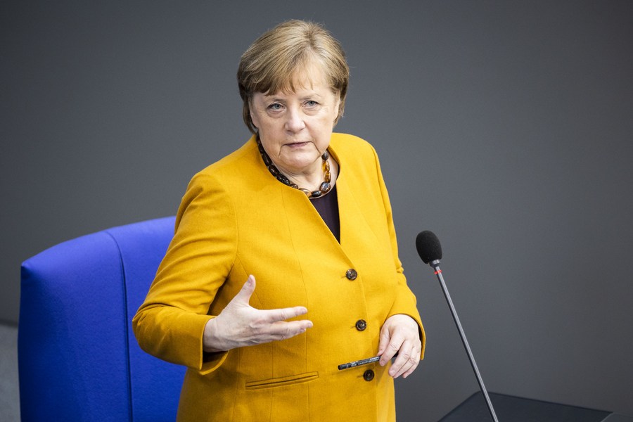 German Chancellor Angela Merkel attends a question session of the German Bundestag in Berlin, capital of Germany, on March 24, 2021. (Florian Gaertner/photothek/Handout via Xinhua)