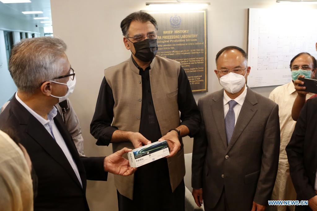 Special Assistant to the Pakistani Prime Minister on Health Faisal Sultan (1st L), Pakistan's Minister for Planning, Development and Special Initiatives Asad Umar (2nd L) and Chinese Ambassador to Pakistan Nong Rong (2nd R) show a box of locally produced Chinese CanSino COVID-19 vaccine in Islamabad, capital of Pakistan, on June 1, 2021. Pakistan launched the locally produced Chinese CanSino COVID-19 vaccine during a ceremony held on Tuesday at the country's National Institute of Health (NIH). (Xinhua/Ahmad Kamal)