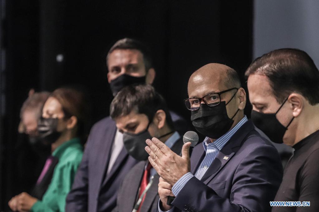 Butantan Institute director Dimas Covas (2nd R) speaks at a press conference in Sao Paulo, Brazil on May 31, 2021. An unprecedented experiment in the world, carried out in Brazil's small town of Serrana, in Sao Paulo State, has succeeded in reducing new deaths from COVID-19 by 95 percent and controlling the pandemic after 75 percent of the adult population received two doses of Chinese company Sinovac's CoronaVac vaccine, local authorities said. (Photo by Rahel Patrasso/Xinhua)