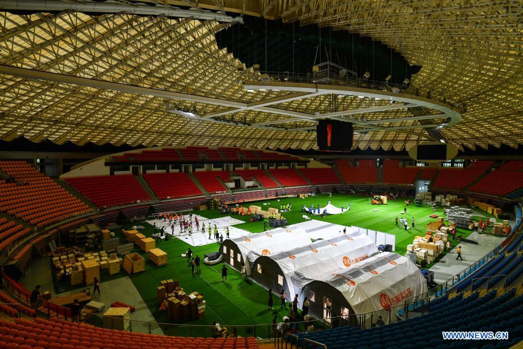 Builders set up temporary laboratories for nucleic acid testing in a stadium in Guangzhou, capital of south China's Guangdong Province, June 1, 2021. Four nucleic acid testing laboratories, with each unit covering an area of 210 square meters, were erected in early morning on June 2, and are about to put into use on June 3. The laboratories are able to test over 120,000 samples a day, which will significantly improve the city's testing capability. (Xinhua/Liu Dawei)
