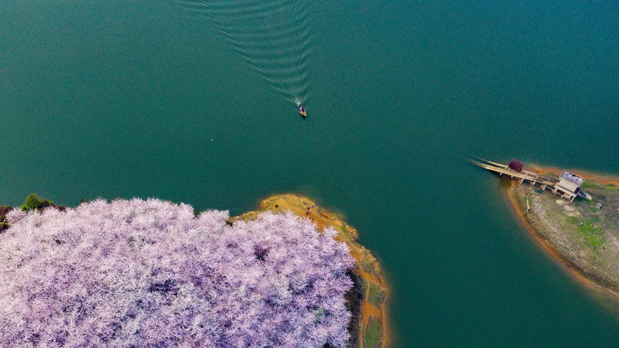 Aerial photo taken on March 15, 2021 shows the scenery of cherry blossoms in Gui'an New District, southwest China's Guizhou Province. (Xinhua/Ou Dongqu)