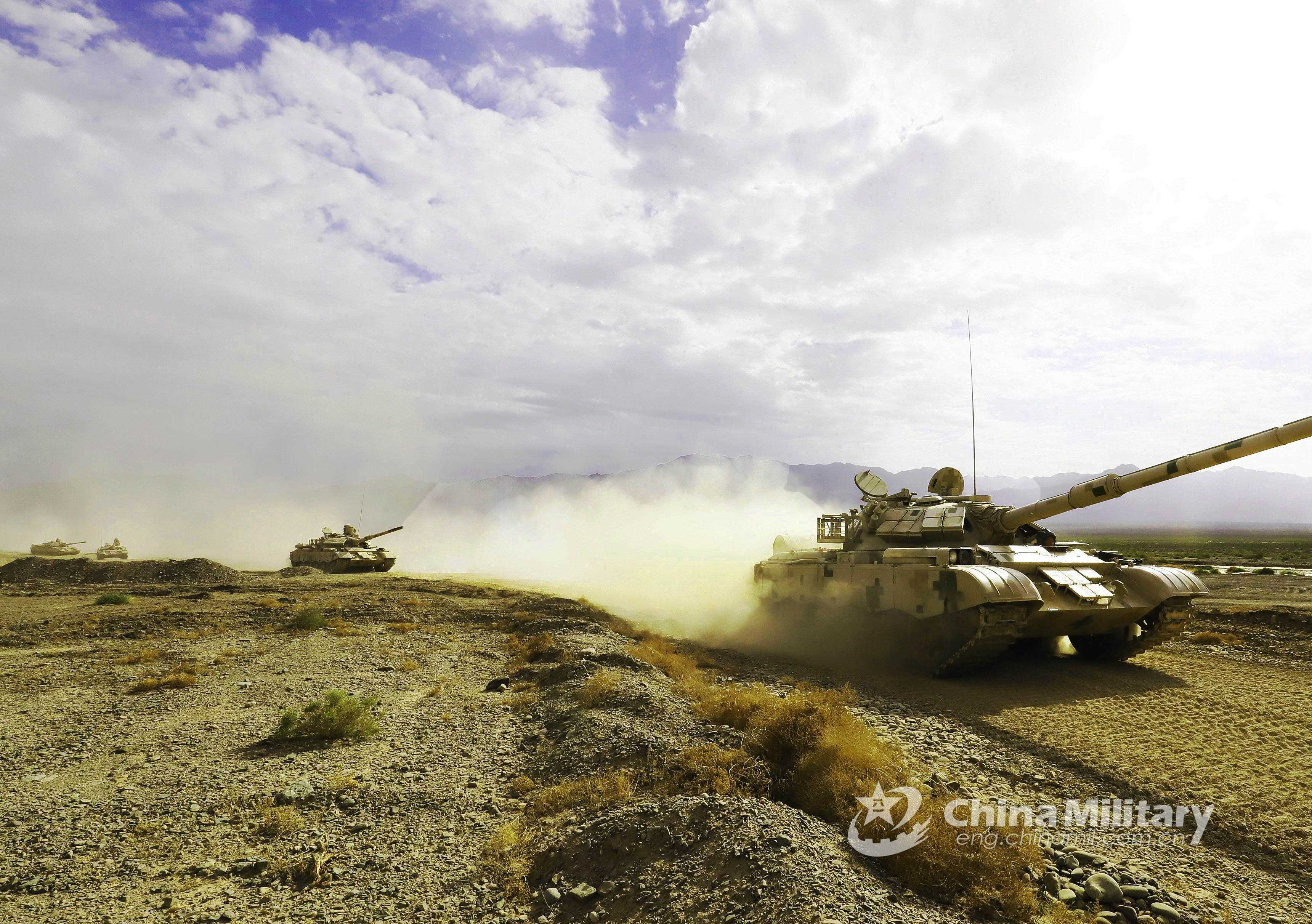 The armored tanks attached to a combined arms brigade under the 77th Group Army gallop in formation at full speed in the wilds during the maneuver training on May 26, 2021. (eng.chinamil.com.cn/Photo by Guo Yuhui)