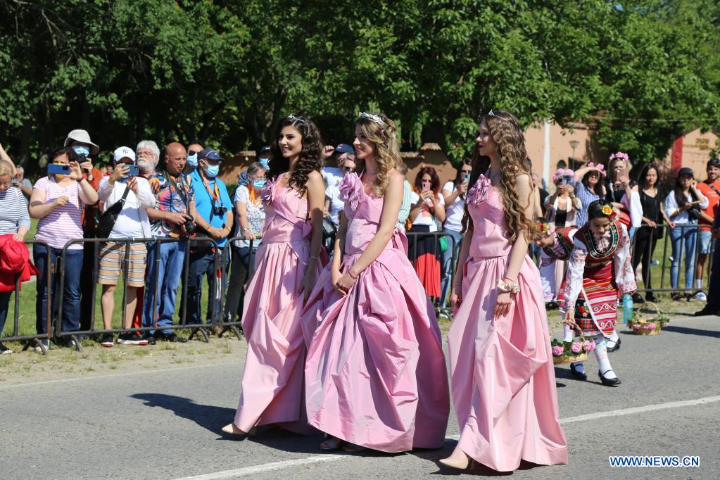 People perform during the rose picking rituals in Kazanlak, Bulgaria, on June 6, 2021. The culmination of the 2021 Rose Festival was witnessed in Kazanlak this weekend. Kazanlak was known for its Rose Festival, which has been organized annually since 1903. The festival celebrates local residents' deep connection to the Rosa Damascena -- the Bulgarian oil-bearing rose -- for centuries. (Xinhua/Lin Hao)