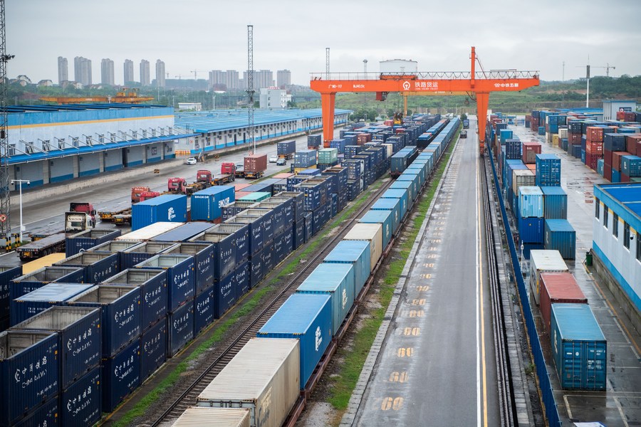 Photo taken on May 22, 2021 shows cargo containers at Changsha north railway station in Changsha, central China's Hunan Province. (Xinhua/Chen Sihan)