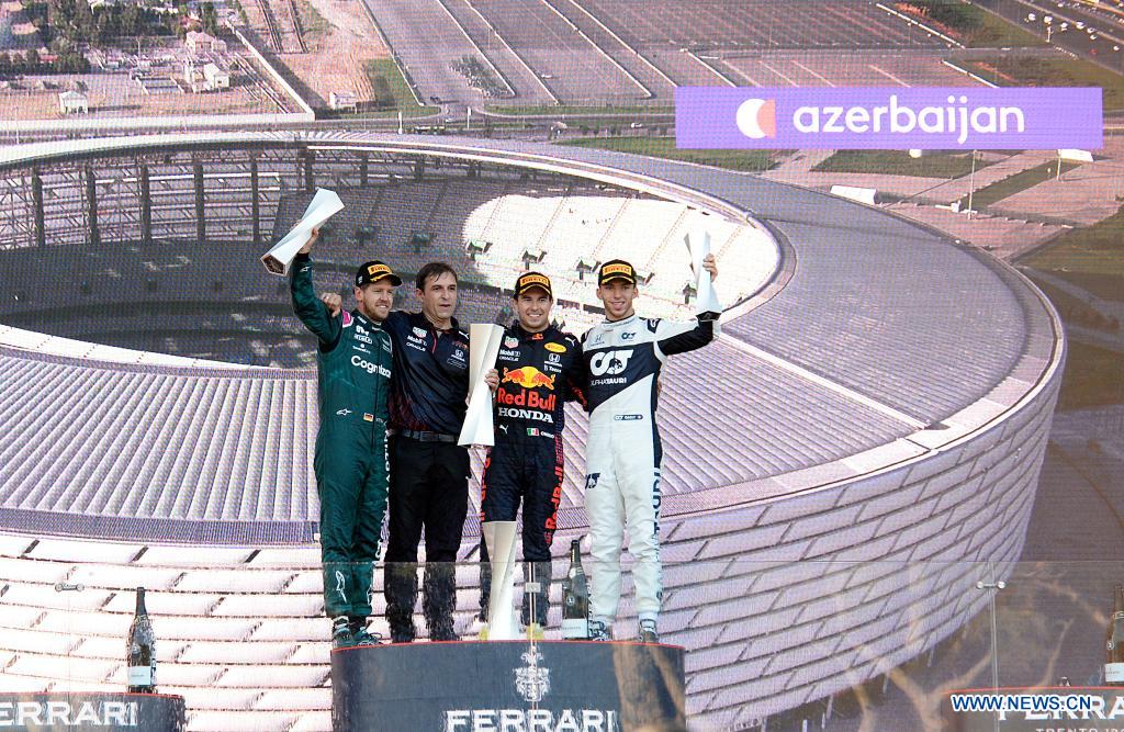Sergio Perez (2nd R) of Reb Bull, Sebastian Vettel (1st L) of Aston Martin and Pierre Gasly (1st R) of AlphaTauri pose for photos during the awarding ceremony for the Formula 1 2021 Azerbaijan Grand Prix at Baku City Circuit in Baku, Azerbaijan, June 6, 2021. (Photo by Tofiq Babayev/Xinhua)