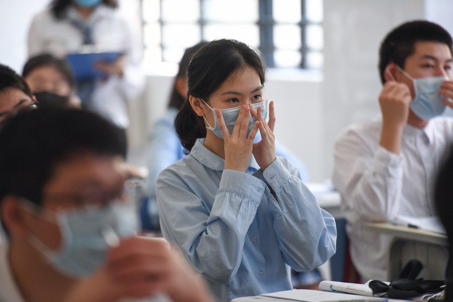 Students of grade 9 learn how to properly wear a face mask at Shenzhen Foreign Languages School in Shenzhen, south China's Guangdong Province, April 27, 2020. (Xinhua/Liang Xu)