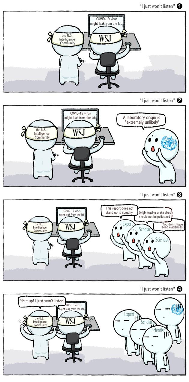 A conclusion from the joint WHO-China study mission has clarified that "a laboratory origin" of the pandemic is "extremely unlikely," yet some U.S. politicians and media are still hyping up this conspiracy theory. Their refusal to accept facts will turn out to be a farce of self-deception. (Caricature by Zhang Jianyuan)