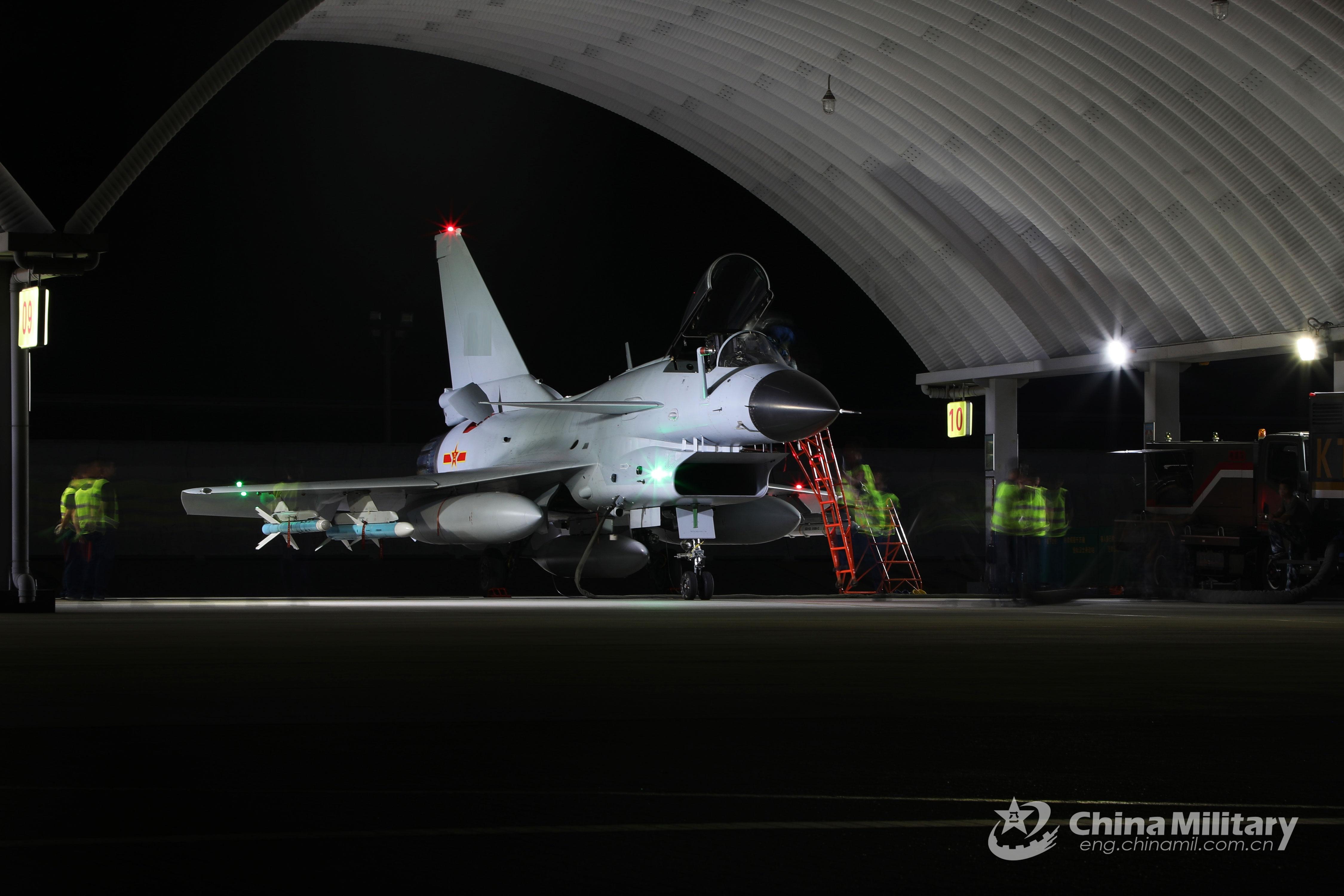 Maintenance men assigned to a brigade with the air force under the PLA Southern Theater Command perform inspections on a fighter jet before a night training exercise on May 26, 2021. (eng.chinamil.com.cn/Photo by Wu Gaoming)