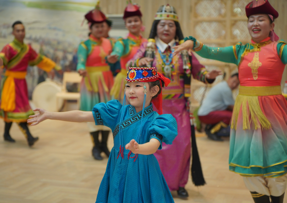 A Mongolian girl in her traditional ethnic dress dances along with accompanying dancers in Korla, northwest China's Xinjiang Uygur Autonomous Region, May 24, 2021. (People's Daily Online/Zhang Ruohan).
