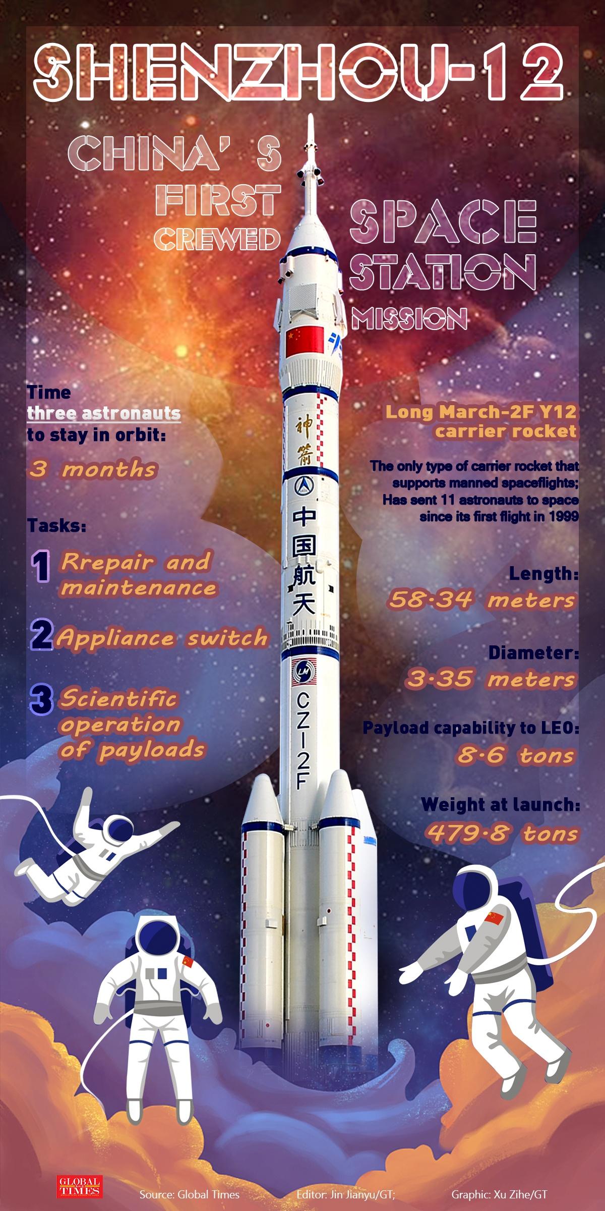 Song Zhongping, a space analyst and TV commentator, told the Global Times on Thursday that China has accumulated rich experience in such practices, and with the "golden partnerships" of Long March-2F and Shenzhou-12, which made a series of improvements on the reliability and safety of the craft, the mission will be carried out smoothly.