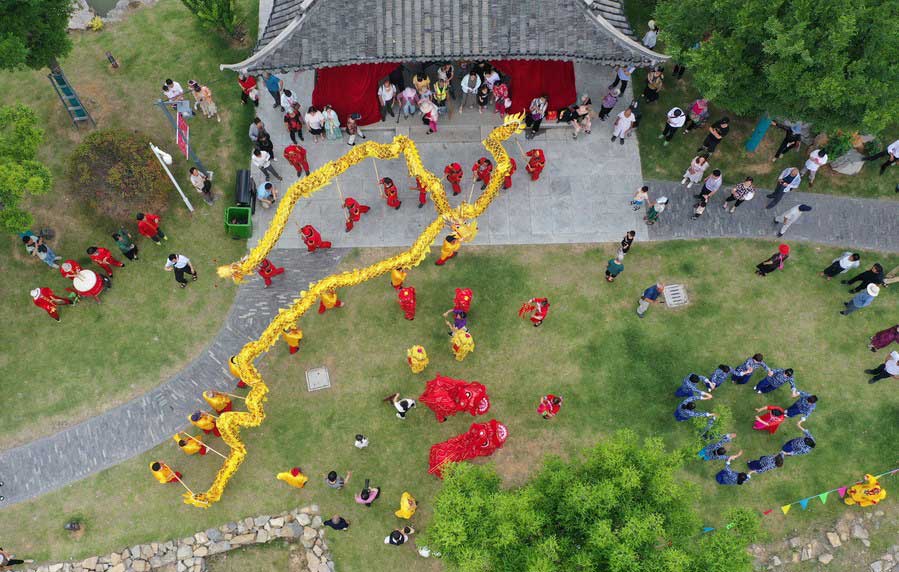 Aerial photo taken on June 13, 2021 shows people watching traditional shows during a celebration of the upcoming Dragon Boat Festival in Xuyi County, Huai'an City, east China's Jiangsu Province. (Xinhua/Ji Chunpeng)