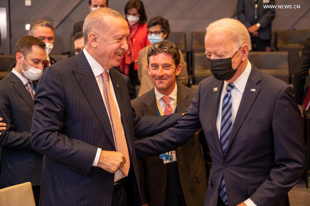 U.S. President Joe Biden (R, Front) talks with Turkish President Recep Tayyip Erdogan (L, Front) during a NATO summit at NATO headquarters in Brussels, Belgium, on June 14, 2021. Leaders of the North Atlantic Treaty Organization (NATO) held a face-to-face summit on Monday to show their unity and agreed on the "NATO 2030" agenda to address future challenges. (NATO/Handout via Xinhua)