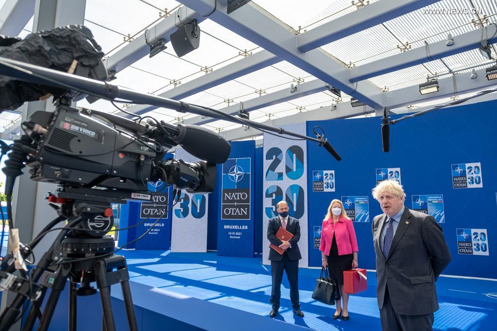 British Prime Minister Boris Johnson (R) arrives for a NATO summit at NATO headquarters in Brussels, Belgium, on June 14, 2021. Leaders of the North Atlantic Treaty Organization (NATO) held a face-to-face summit on Monday to show their unity and agreed on the "NATO 2030" agenda to address future challenges. (NATO/Handout via Xinhua)