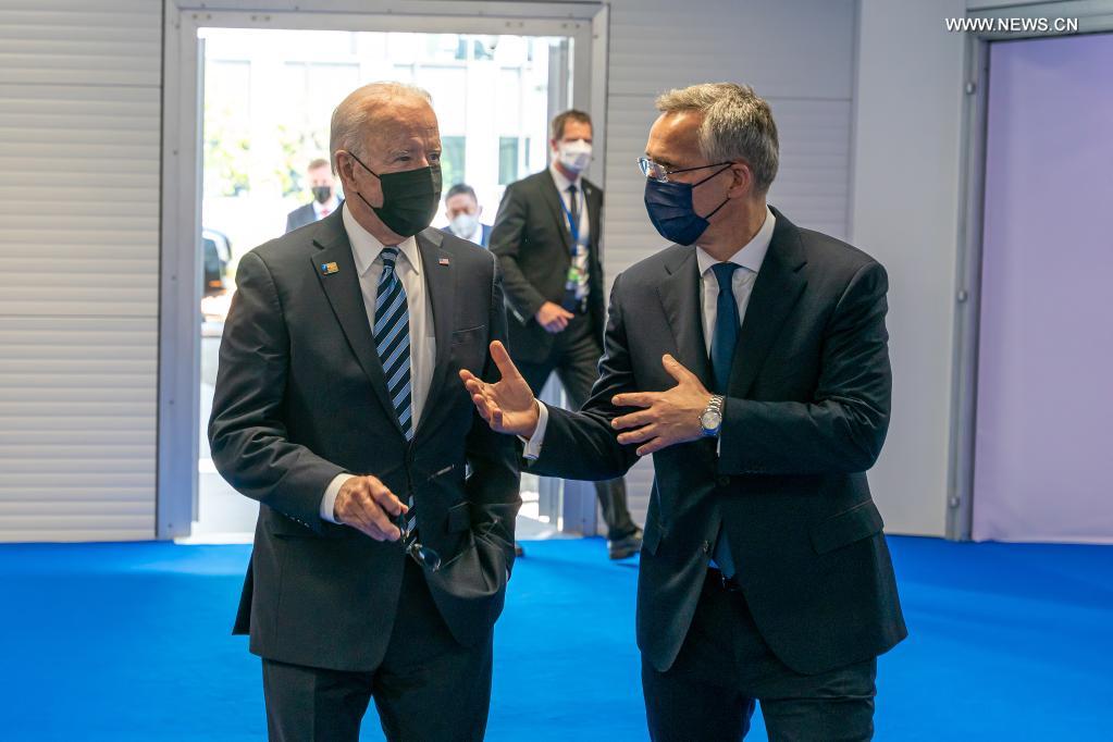 NATO Secretary General Jens Stoltenberg (R, Front) welcomes U.S. President Joe Biden (L, Front) at NATO headquarters in Brussels, Belgium, on June 14, 2021. Leaders of the North Atlantic Treaty Organization (NATO) held a face-to-face summit on Monday to show their unity and agreed on the "NATO 2030" agenda to address future challenges. (NATO/Handout via Xinhua)