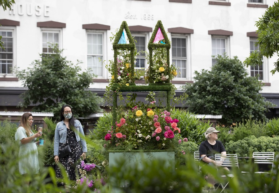 People enjoy themselves during a flower festival in New York, the United States, June 12, 2021. (Xinhua/Wang Ying)