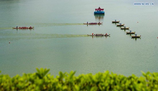 People participate in a dragon boat race to celebrate the Dragon Boat Festival in Zigui County, central China's Hubei Province, June 14, 2021. China celebrated the Dragon Boat Festival on Monday to commemorate Qu Yuan, a patriotic poet from the Warring States Period (475-221 BC) believed to have been born in Zigui County. (Photo by Xiang Hongmei/Xinhua)