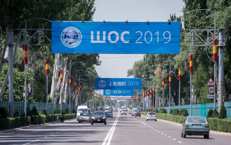 Photo taken on June 9, 2019 shows banners for Shanghai Cooperation Organization (SCO) meeting on a street in Bishkek, capital of Kyrgyzstan. (Xinhua/Fei Maohua)