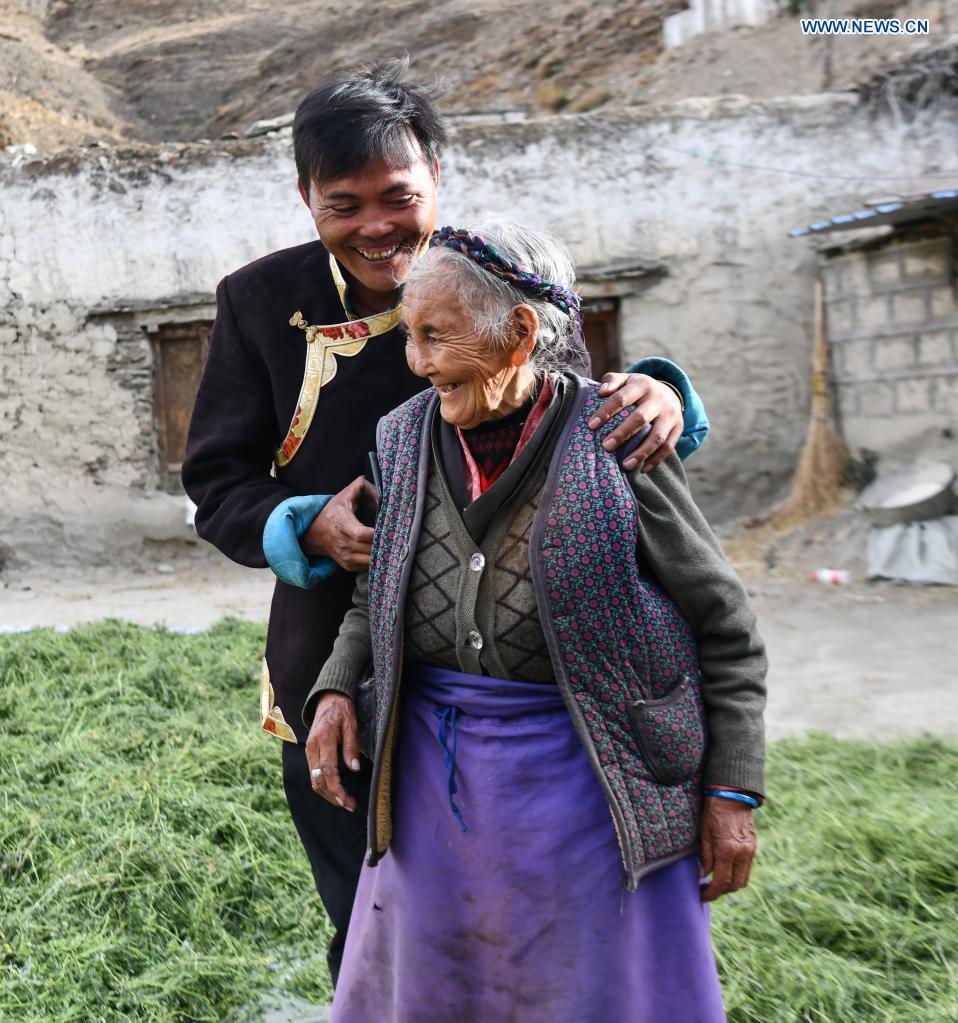Tsering Yangzom and her son are pictured at Qoide'og Village in Nedong County of Shannan City, southwest China's Tibet Autonomous Region, June 3, 2021. Tsering Yangzom, 87, was a serf and lived under cruel feudal serfdom before the democratic reform in Tibet. Tsering Yangzom was born to a family of serfs, and could never forget the difficult times when her family had no choice but to feed on leftovers of better-off households. "My parents brought me to this world, but my life belonged to the serf owner just like them," she recalled. The democratic reform in 1959 freed Tsering Yangzom from serfdom. She was provided with farmland and livestock. When the Sino-Indian border conflict broke out in 1962, Tsering Yangzom immediately signed up for the logistics and transportation team and followed the People's Liberation Army all the way to the front line, defending the hard-won freedom. "Now I don't have to worry about food, clothing and shelters anymore," Tsering Yangzom said, "I intend to live a long happy life." (Xinhua/Purbu Zhaxi)