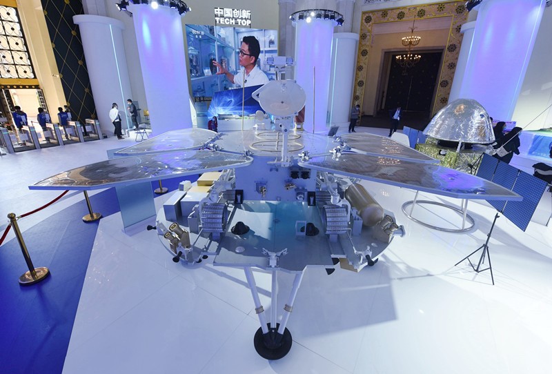 Photo taken on Oct. 30, 2020, shows models of the lander and rover of China’s first Mars probe Tianwen-1 exhibited at the 2020 Global Technology Transfer Fair held in east China’s Shanghai. (People’s Daily Online/Long Wei)