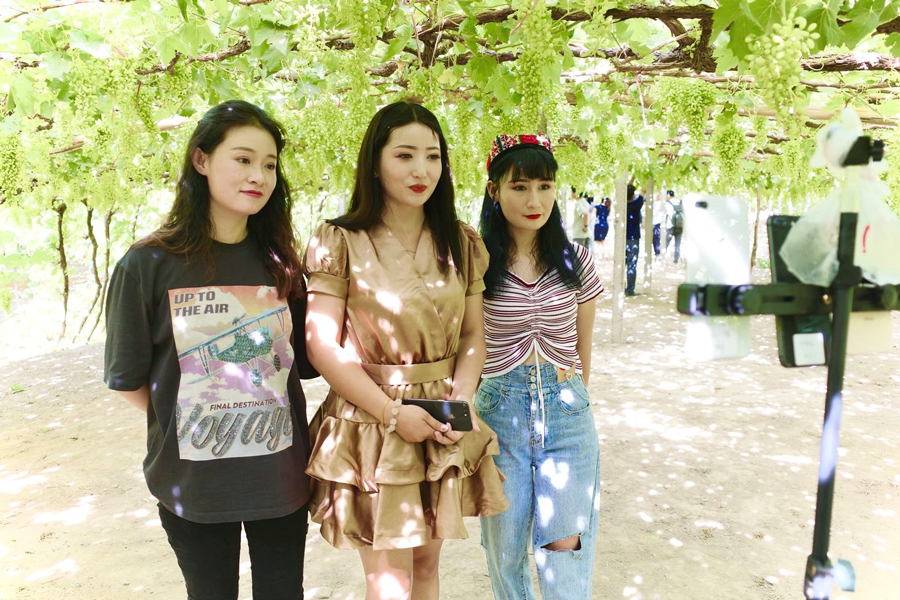 Muqeddes Weli (center), a social media influencer, helps grape growers sell grapes via a live-streamed video at a vineyard in Turpan, northwest China's Xinjiang Uygur Autonomous Region, May 28, 2021. (People's Daily Online/Kou Jie)