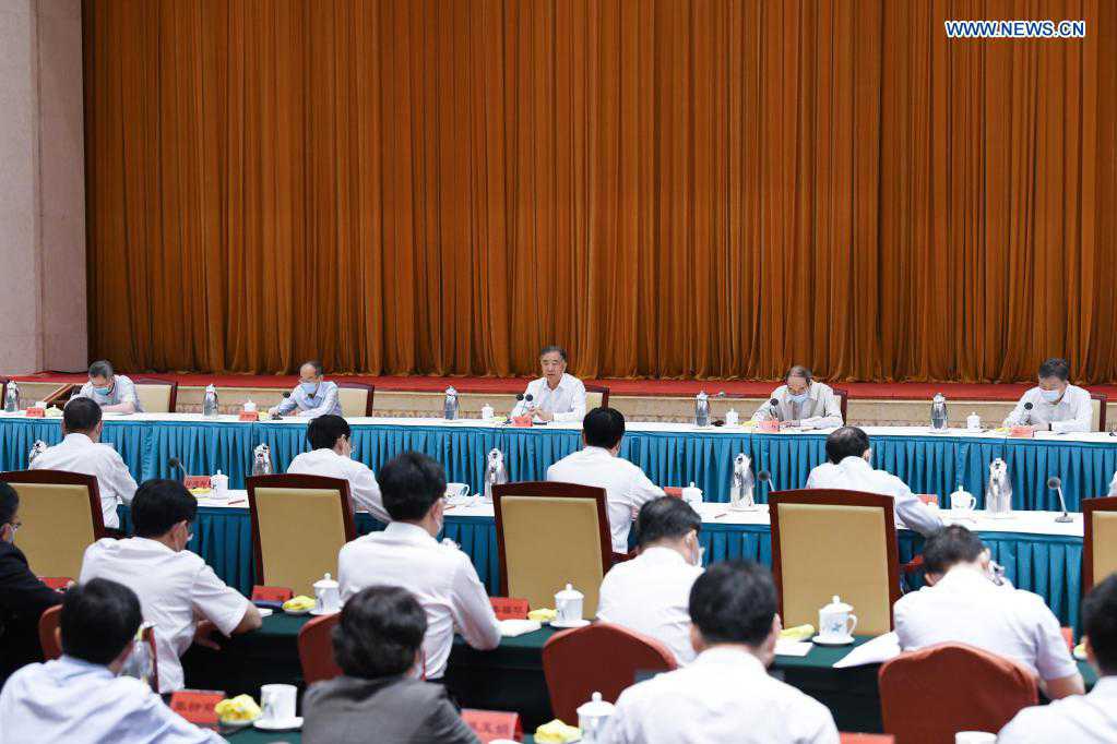 Wang Yang, a member of the Standing Committee of the Political Bureau of the Communist Party of China (CPC) Central Committee and chairman of the National Committee of the Chinese People's Political Consultative Conference, attends a symposium with heads of the central committees of non-Communist parties and the All-China Federation of Industry and Commerce (ACFIC) in Beijing, capital of China, June 16, 2021. The symposium was convened by the United Front Work Department of the CPC Central Committee to discuss research results on strengthening national strategic capacity in science and technology. The research was conducted by relevant non-Communist parties and organizations. (Xinhua/Rao Aimin)