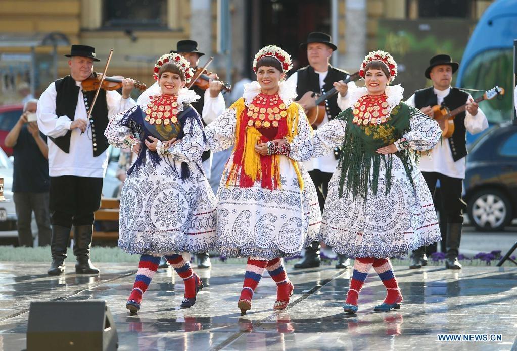 Members of the National Folk Dance Ensemble of Croatia LADO perform on the outdoor summer stage of Croatian National Theater in Zagreb, Croatia, June 16, 2021. (Matija Habljak/Pixsell via Xinhua)