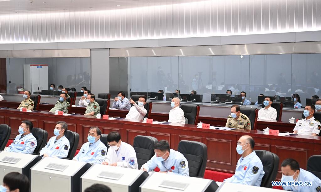 Chinese Vice Premier Han Zheng, also a member of the Standing Committee of the Political Bureau of the Communist Party of China Central Committee, watches the live broadcast of the Shenzhou-12 mission launch and extends warm greetings and congratulations to all members who participated in the mission at the Beijing Aerospace Control Center, in Beijing, capital of China, June 17, 2021. The crewed Shenzhou-12 spaceship, launched from the Jiuquan Satellite Launch Center in northwest China at 9:22 a.m. (Beijing Time), successfully docked with the space station core module Tianhe at 3:54 p.m., forming a three-module complex with the cargo craft Tianzhou-2. (Xinhua/Li Xiang)