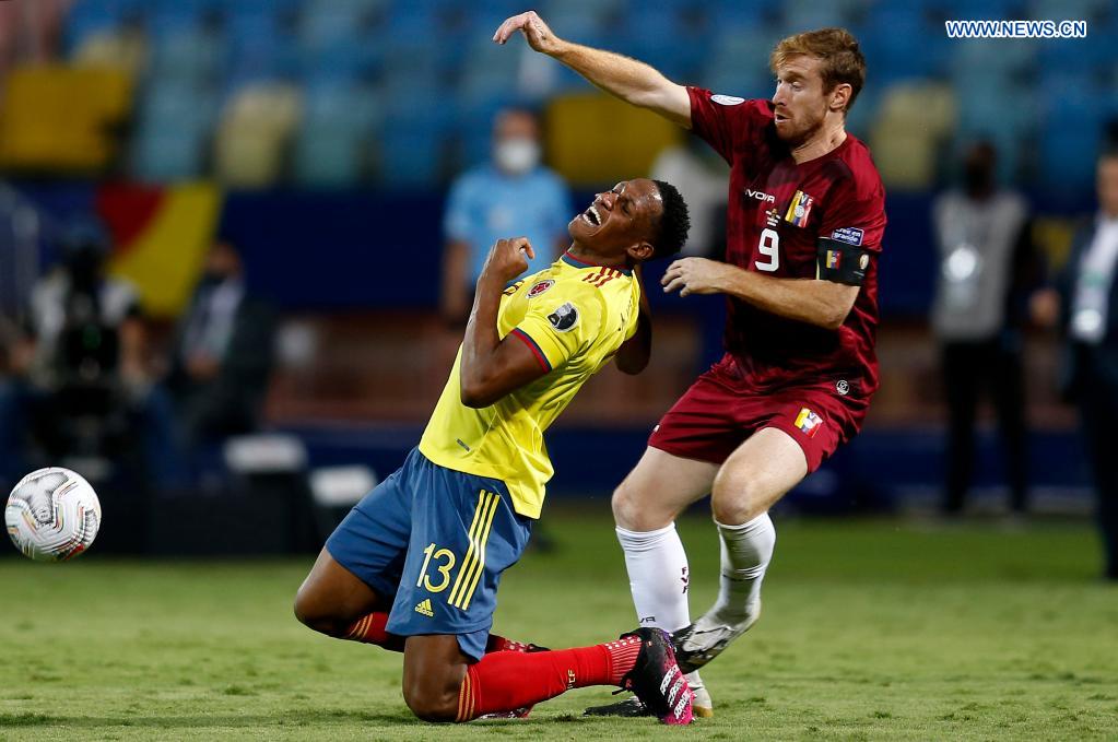 Colombia's Yerry Mina (L) vies with Venezuela's Fernando Aristeguieta during the 2021 Copa America Group A football match in Goiania, Brazil, June 17, 2021. (Xinhua/Lucio Tavora)