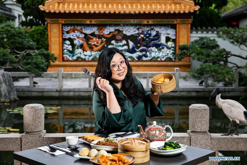 Jennifer Wong, hostess of "Chopsticks or Fork?", dines in style at the Chinese Garden of Friendship, Darling Harbour in Sydney, Australia, on April 17, 2021. (Photo by Teresa Tan/Handout via Xinhua)
