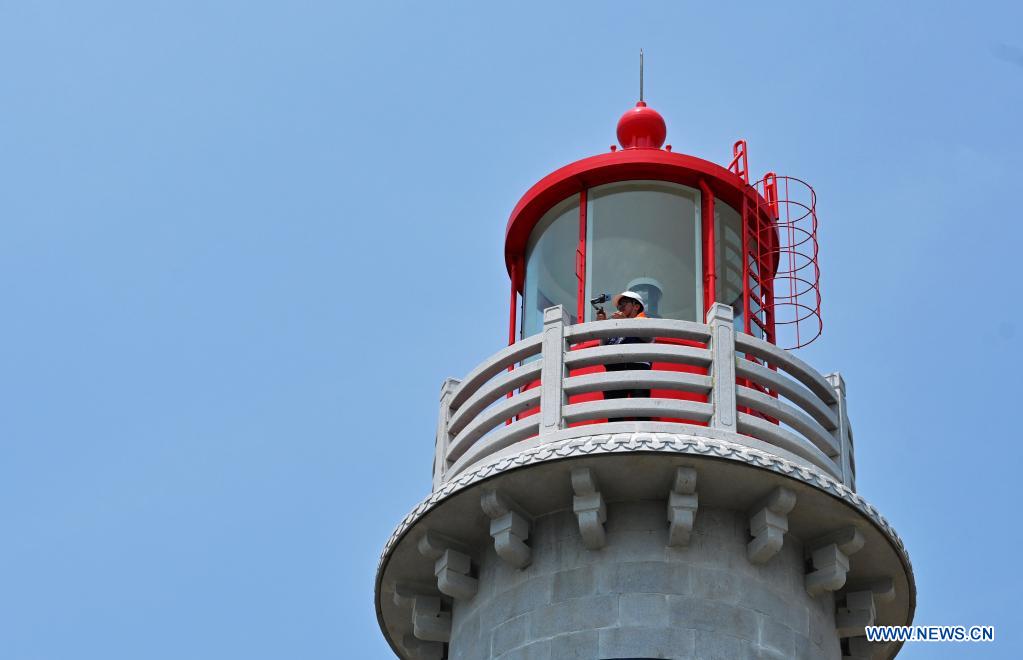 Photo taken on June 19, 2021 shows the top of the Chidingyu Lighthouse in Quanzhou, southeast China's Fujian Province. Chidingyu Lighthouse, located at the key turning point of the inner route on the west side of the Taiwan Strait, was officially put into operation on Saturday. It is powered by green energy and covers a light range of more than 15 nautical miles. The lighthouse is equipped with modern navigation devices which meet the needs of different kinds of ships in and out of Quanzhou Bay. (Xinhua/Wei Peiquan)