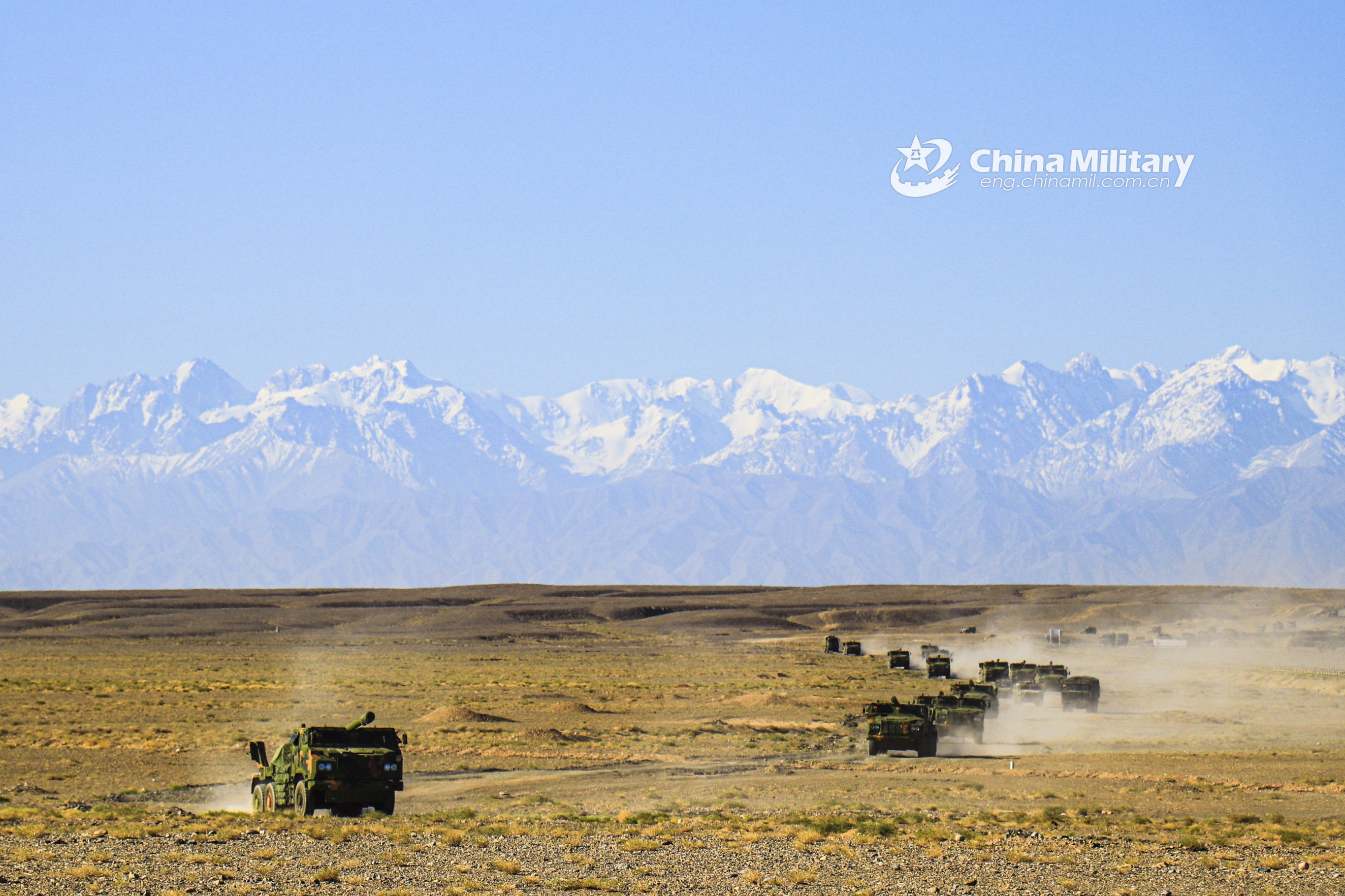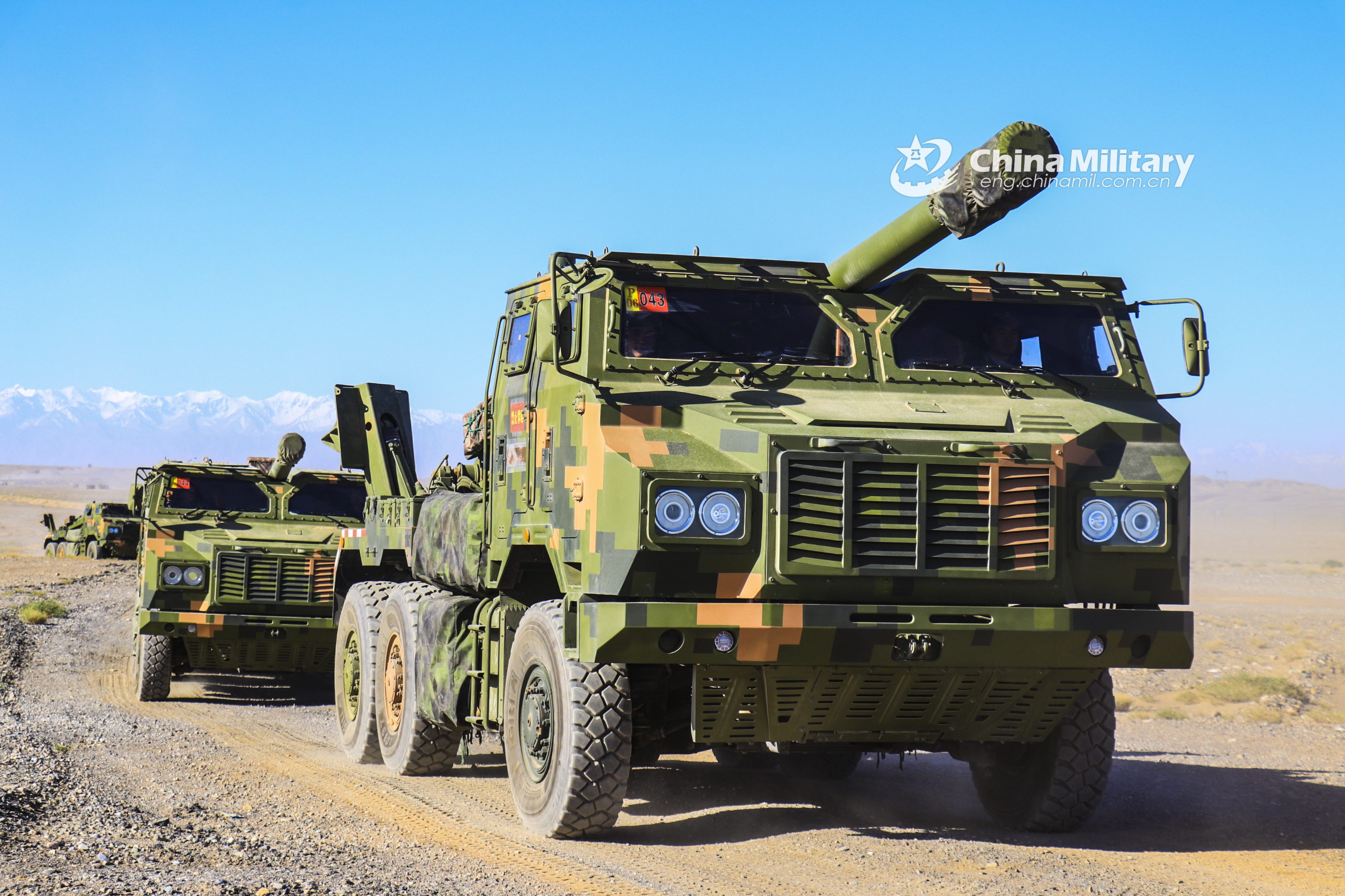 A group of launcher trucks carrying new vehicle-mounted gun-howitzer systems are en route to a designated training field in northwest China's Gobi Desert on June 3, 2021. (eng.chinamil.com.cn/Photo by Wu Shengwei)