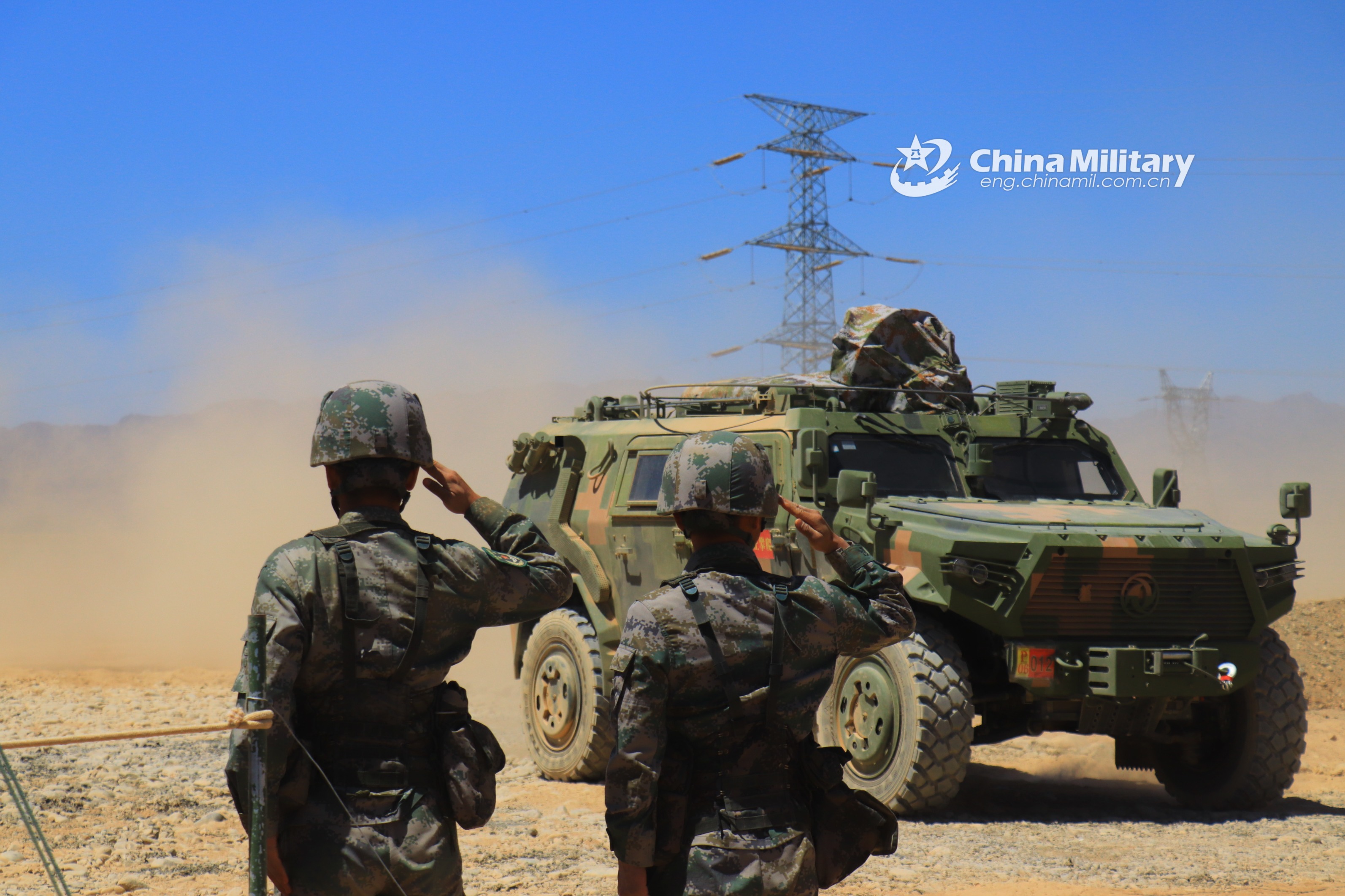 Soldiers salute as a military vehicle, performing as the commanding car, passes along the road during a long-distance maneuver in northwest China's Gobi Desert on June 3, 2021. (eng.chinamil.com.cn/Photo by Wu Shengwei)