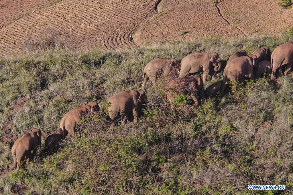Aerial photo taken on June 19, 2021 shows a herd of wild Asian elephants in Dalongtan Township of Eshan County, Yuxi City, southwest China's Yunnan Province. From June 18 to June 19, China's famous herd of wandering elephants has headed 3.09 km southwest and continued to linger in Dalongtan Township of Eshan County. An elephant that strayed 14 days ago was about 24.9 km away from the herd, and all the 15 elephants were safe and sound, according to the headquarters in charge of monitoring their migration. (Xinhua)