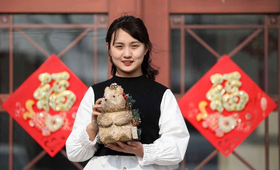 Yan Jiaxin shows a handicraft product she has made in Qiaotuo Village of Tai'an County, Anshan, northeast China's Liaoning Province, March 4, 2021. (Xinhua/Yao Jianfeng)