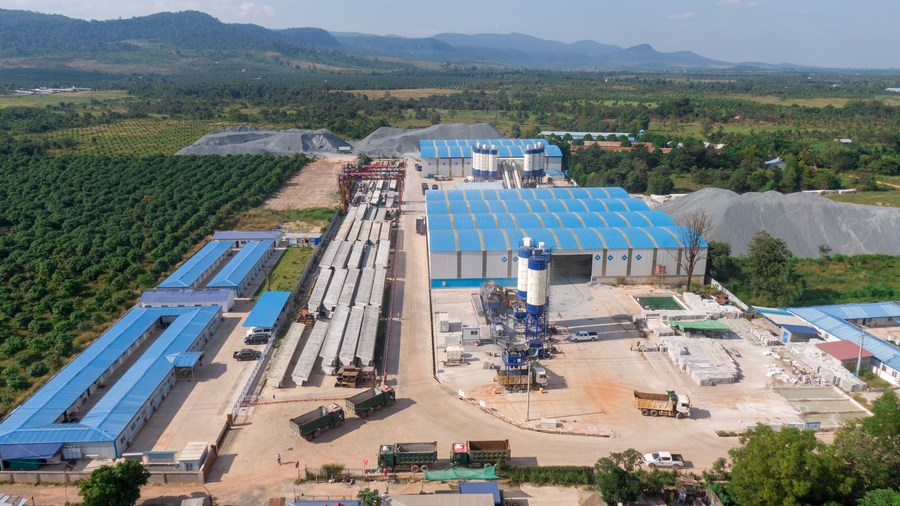Aerial photo taken on Nov. 15, 2020 shows a concrete mixing plant at the construction site of the first expressway in Cambodia in Kampong Speu Province, Cambodia. (Photo by Li Zhen/Xinhua)