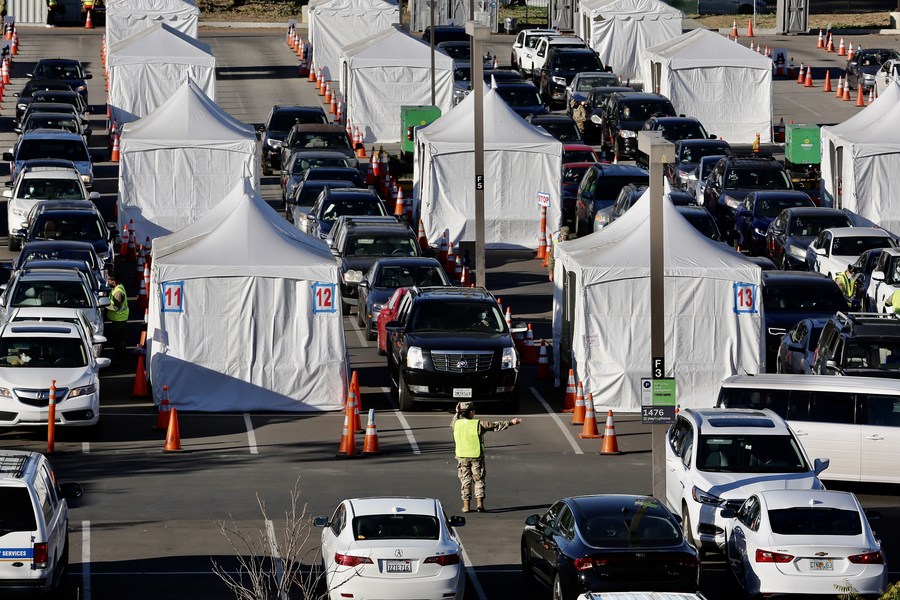 Members of the National Guard help motorists check at a COVID-19 vaccination site on the campus of California State University of Los Angeles in Los Angeles County, California, the United States, Feb. 22, 2021. (Xinhua)