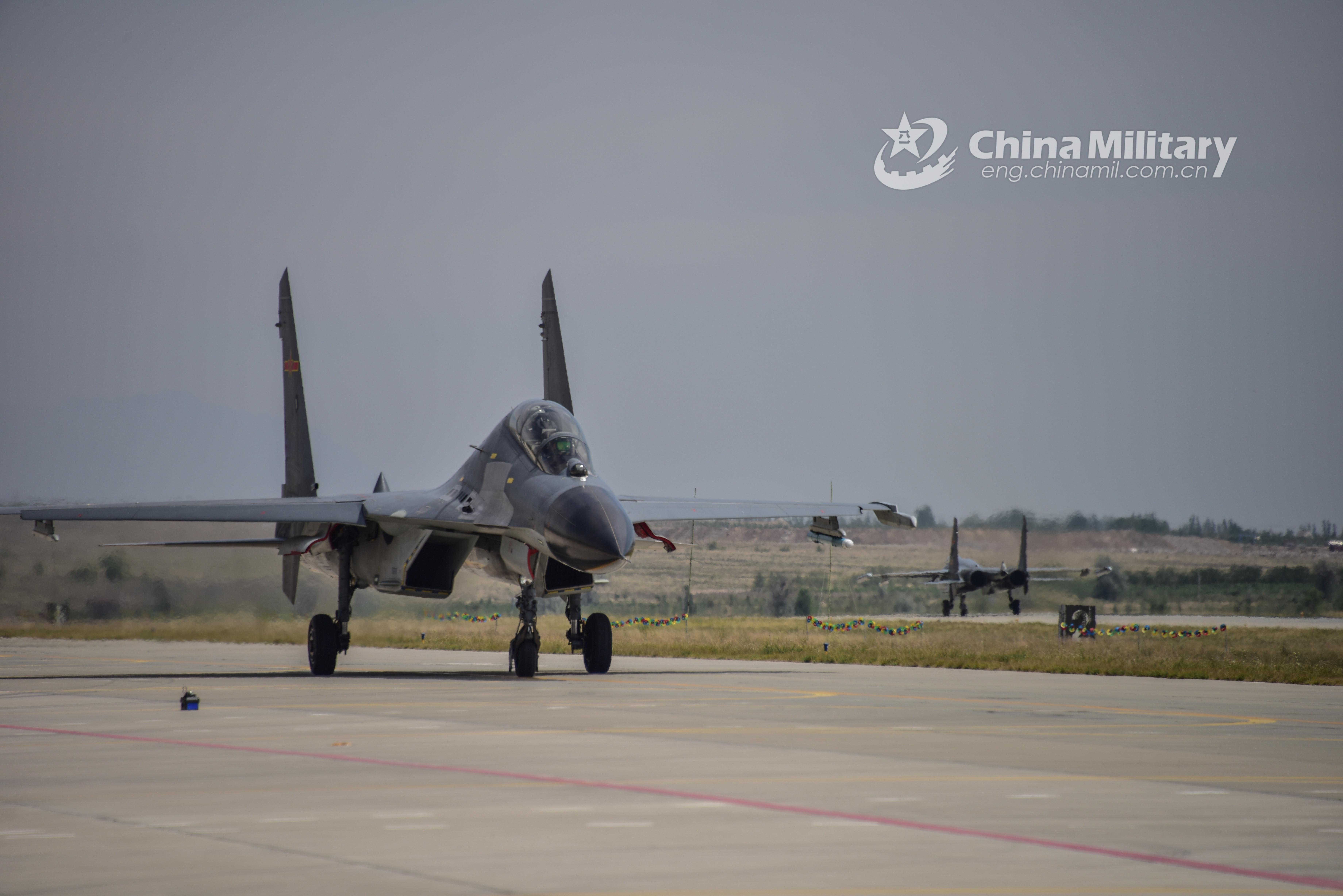 Two fighter jets attached to an aviation brigade of the air force under the PLA Western Theater Command taxi on the flightline in sequence under control tower’s command during a flight training exercise on June 10, 2021. (eng.chinamil.com.cn/Photo by Cao Yukun)